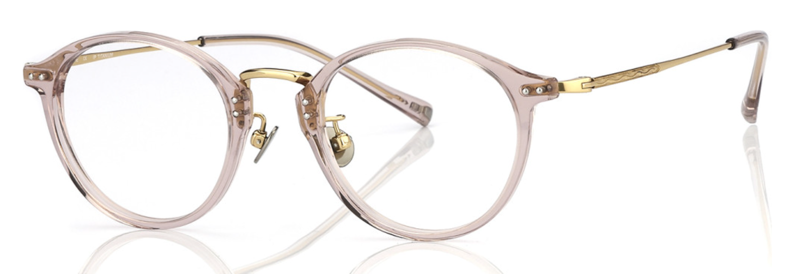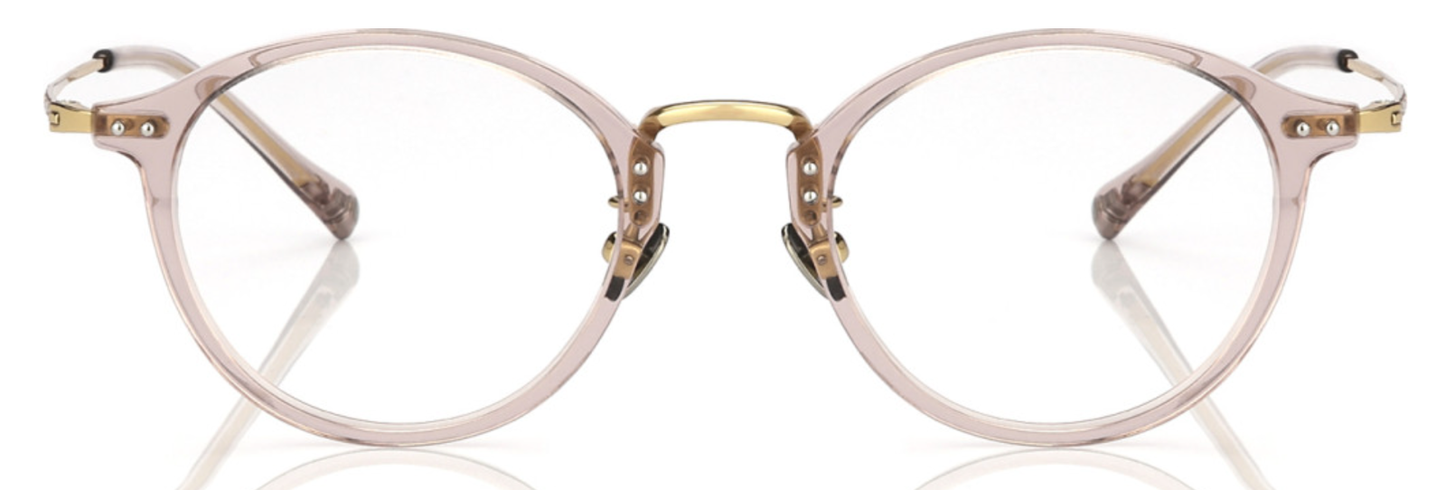 Eleye MW/128 C2 : monture pantos 47/21 en acétate crystal rose et métal doré. Des lunettes légères, lumineuses et élégantes, au style raffiné et moderne.