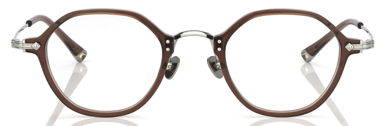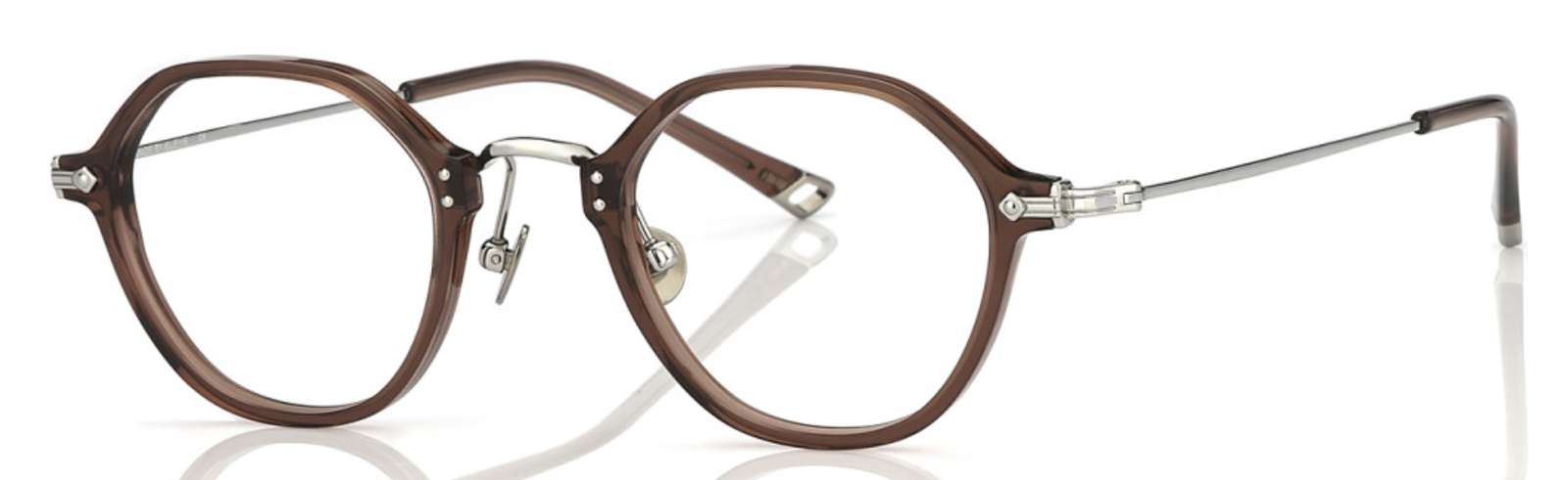 Eleye MW/253 C9 : monture ronde 40/23 en acétate crystal marron et métal argenté. Des lunettes légères, raffinées et modernes, au style rétro chic.