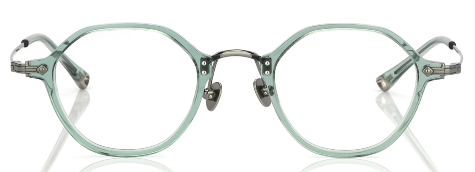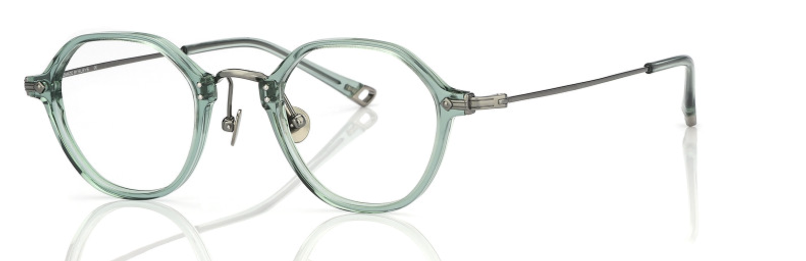 Eleye MW/253 C2 : monture ronde 40/23 en acétate crystal vert et métal gun. Des lunettes modernes, légères et élégantes, au style distinctif et raffiné.