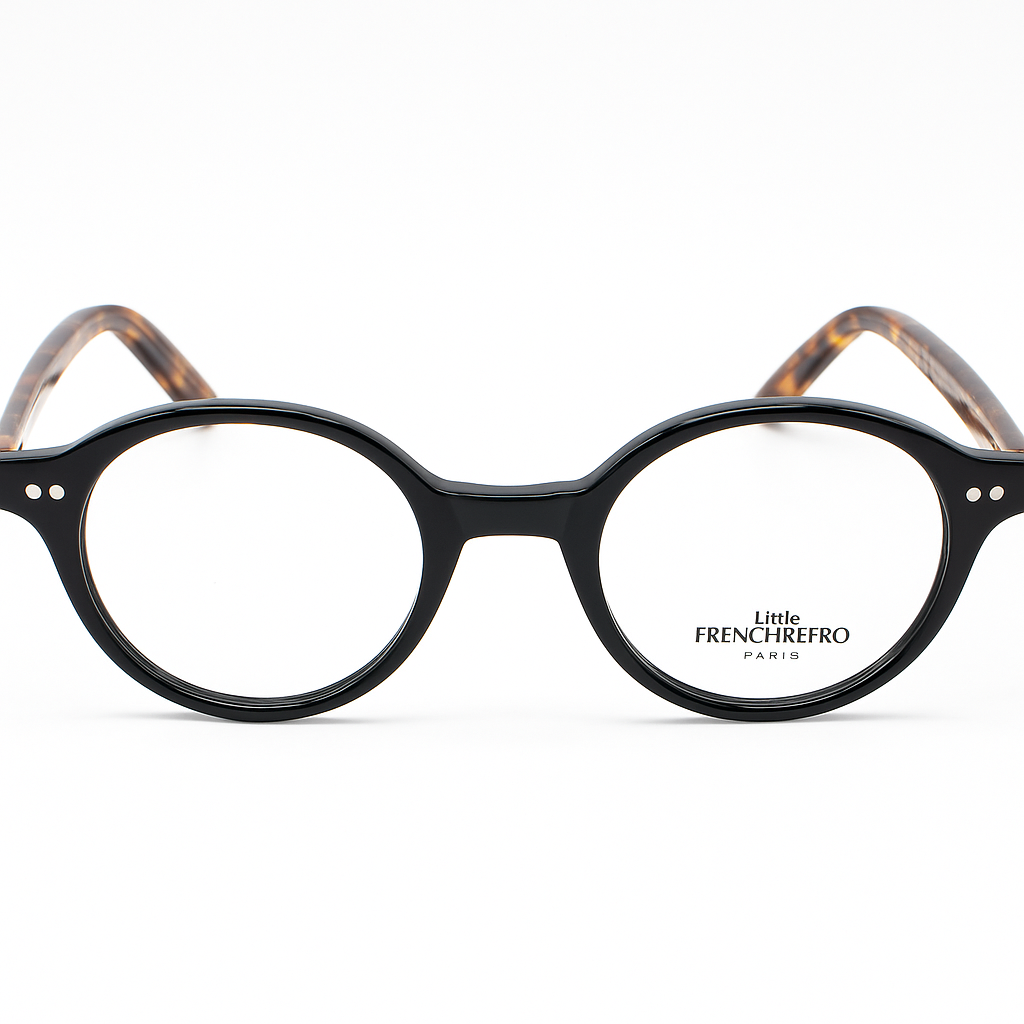 Little French Retro Carla G58 : monture enfant ronde en acétate noir et écaille. Des lunettes solides, élégantes et confortables.