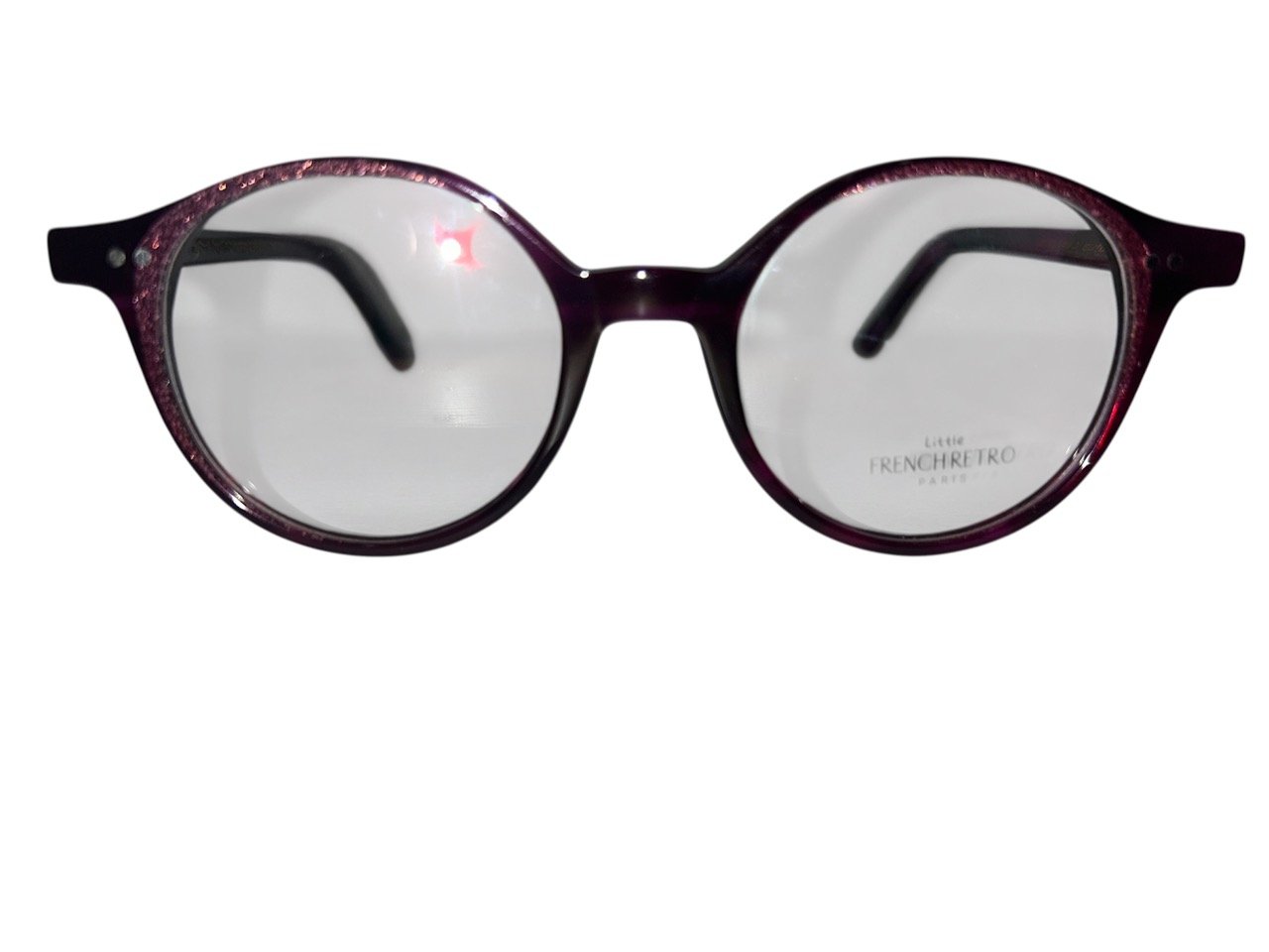 Little French Retro Carla G105 : monture enfant ronde en acétate rose pailleté. Des lunettes ludiques, chic et résistantes.